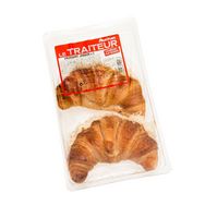Une barquette de 2 croissants garnis d'une tranche de jambon et d'une sauce bechamel a l'emmental avec un décor d'emmental râpé.