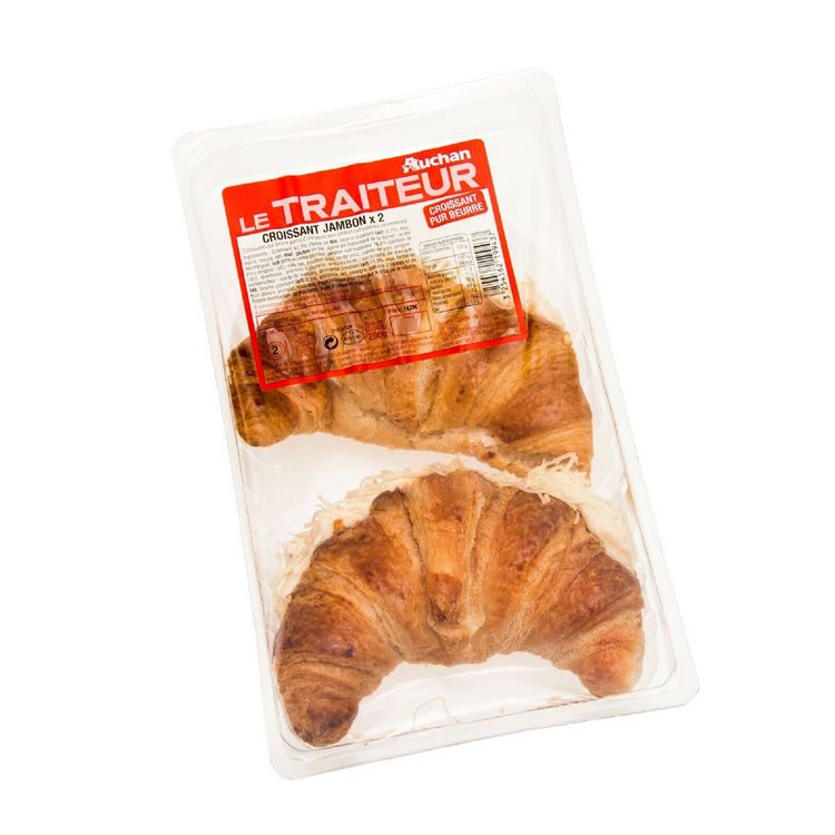 Ingrédients : croissant 40,3% (farine de blé, beurre 9,5%, eau, sucre, levure, sel, oeuf, gluten de blé, agent de traitement de la farine : acide ascorbique), lait demi-écrémé stérilisé, jambon cuit supérieur 16,8% (jambon de porc (origine UE), eau, sel, bouillon (eau, os de porc, viande de porc (origine : UE)), dextrose, arômes naturels, antioxydant : ascorbate de sodium, conservateur : nitrite de sodium), emmental 11,9%, eau, farine de ble, beurre 1,1%, amidons, sel, vinaigre, extraits d'épices et de fruit (poivre, acérola), muscade. Traces éventuelles de moutarde, fruits à coque, poisson et soja.