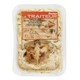 Ingrédients : "Râble de lapin braisé (Origine France) 42,8%, tagliatelles cuites 31,4% [eau, tagliatelles (semoule de BLE dur, OEUF frais) 11,8%, huile de colza, sel], eau, CREME (LAIT), MOUTARDE 2,9% (eau, graines de MOUTARDE, vinaigre d'alcool, sel, acidifiant : acide citrique, conservateur : METABISULFITE de potassium, contient SULFITES), carottes Filière Responsable Auchan 1,4%, MOUTARDE à l'ancienne 1,1% (eau, graines de MOUTARDE, vinaigre, sel, contient SULFITES), échalote, farine de BLE, fond de veau (viande et jus de cuisson de veau, sel), amidon modifié de maïs, sel, poivre blanc. Traces éventuelles de soja, céleri, poisson, mollusques, crustacés, graines de sésame, fruits à coque et arachides.