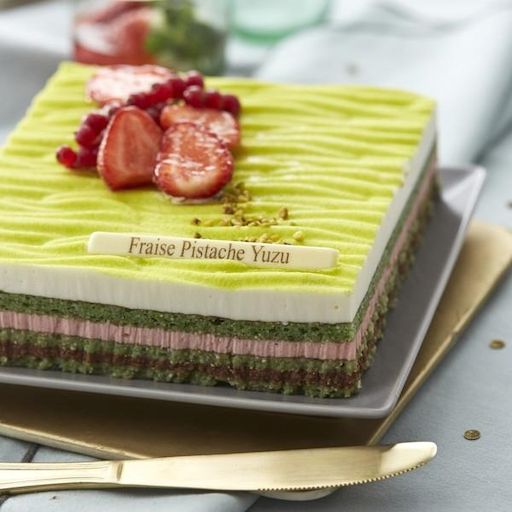 Un savoureux gâteau, mêlant savamment un biscuit moelleux à la pistache, un croustillant gianduja, une mousse fraise et une onctueuse mousse au yuzu : un dessert qui ravira petits et grands gourmands !