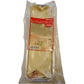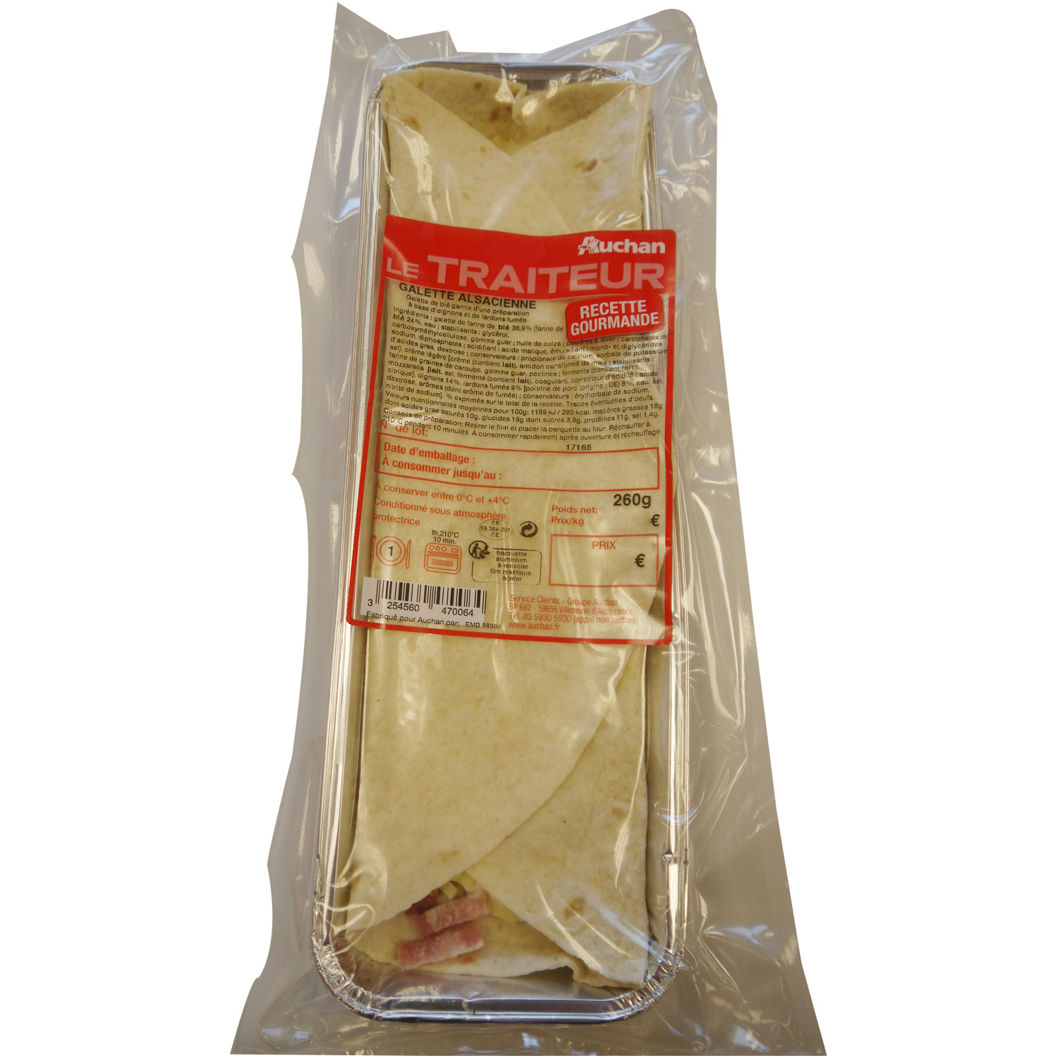 Galette de blé garnie d'une préparation à base d'oignons et de lardons fumés