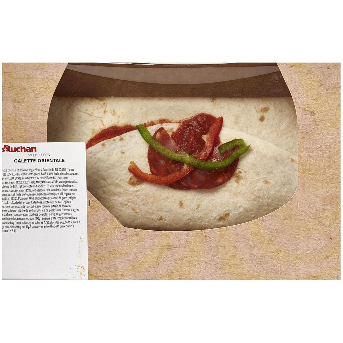 galette de farine de blé 38% (farine de BLE 65 %, eau, stabilisant: E422 E466 E412, huile de colza non hydrogenee, poudre a lever: E500 E450, acidifiant: E296, emulsifiant: E471, dextrose, conservateur: E282 E202, sel), mozzarella râpée (LAIT de vache pasteurisé (origine UE), protéines de LAIT, sel, correcteur d'acidité : E330, ferments LACTIQUES, coagulant microbien, conservateur : E202, anti agglomérant : amidon), sauce à pizza 19,4% (98 % tomates, sel, huile de tournesol, sucre, herbes aromatiques, ail, régulateur d'acidité : E330), poivron lanière 9,7% (poivrons rouge et vert), chorizo 7,8% (viande de porc (origine ue), sel, maltodextrine, paprika, LACTOSE, proteines de LAIT, épices, dextrose, antioxydant : E301, E392, conservateurs : E250, E252, ferments. agent de surface : conservateur : E202. 128g de viande utilisés pour la préparation de 100g de produit fini), origan.
