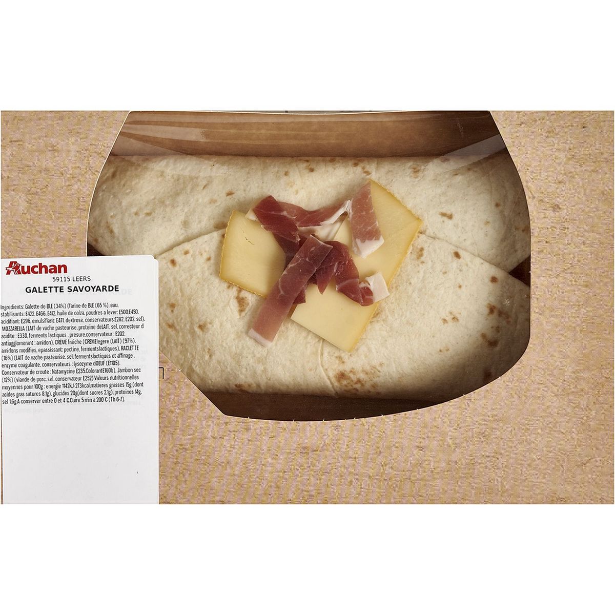 galette de farine de blé 34% (farine de BLE 65 %, eau, stabilisant: E422 E466 E412, huile de colza non hydrogenee, poudre a lever: E500 E450, acidifiant: E296, emulsifiant: E471, dextrose, conservateur: E282 E202, sel), mozzarella râpée (LAIT de vache pasteurisé (origine UE), protéines de LAIT, sel, correcteur d'acidité : E330, ferments LACTIQUES, coagulant microbien, conservateur : E202, anti agglomérant : amidon), Crème fraîche légère épaisse (CRÈME légère pasteurisée (Origine France) 97%, amidon modifié, épaississant : E440, ferments LACTIQUES), Fromage à raclette 15,6% (LAIT de vache pasteurisé, sel, ferments LACTIQUES et affinage, enzyme coagulante, conservateur de croûte : E235), jambon cru 12,2% (viande de porc (Origine UE), sel).