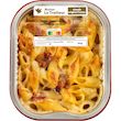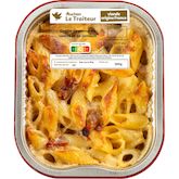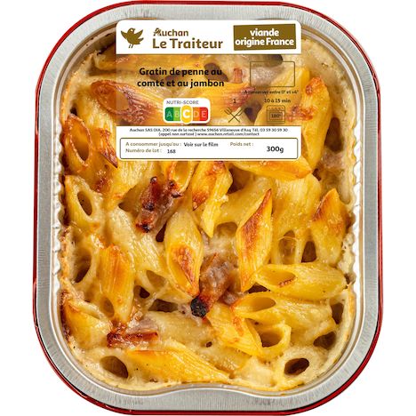 Pâte cuite 38% (eau, semoule de BLÉ dur de qualité supérieure), LAIT demi-écrémé, eau, COMTÉ 8%, jambon cuit standard 8% [jambon de porc 5,7% (origine : France), eau, dextrose, sel, arôme naturel, antioxydant : ascorbate de sodium, conservateur : nitrite de sodium], BEURRE, farine de BLÉ, amidon, sel, épaississant : gomme xanthane, poivre, muscade.