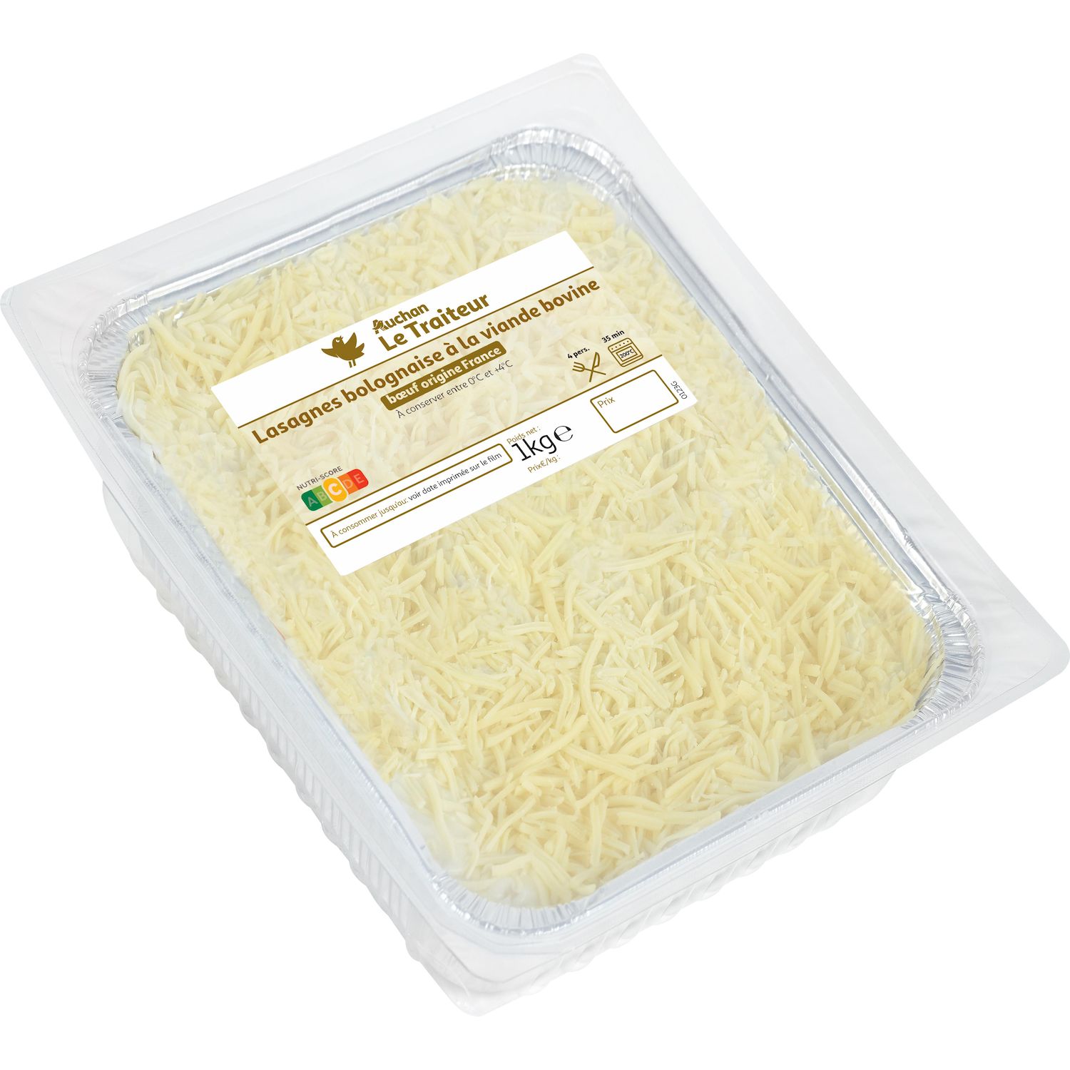 Eau, pâtes alimentaires 20% (semoule de BLE dur, eau), viande bovine 12,2% (origine : France), triple concentré de tomate 6,3%, emmental 5% (LAIT), tomates 4,7%, oignons, carottes, huile de colza, farine de BLE, amidon modifié de maïs, purée de carotte, huile d'olive vierge extra, LAIT écrémé en poudre, sel, plantes aromatiques, ail, épices.