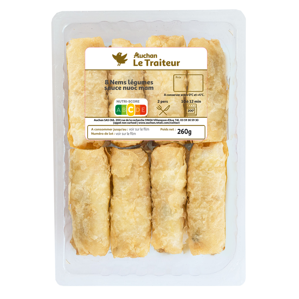 Au four : préchauffer le four 10 minutes à 200°C (th 7/8) et réchauffer les nems 10 à 15 minutes.