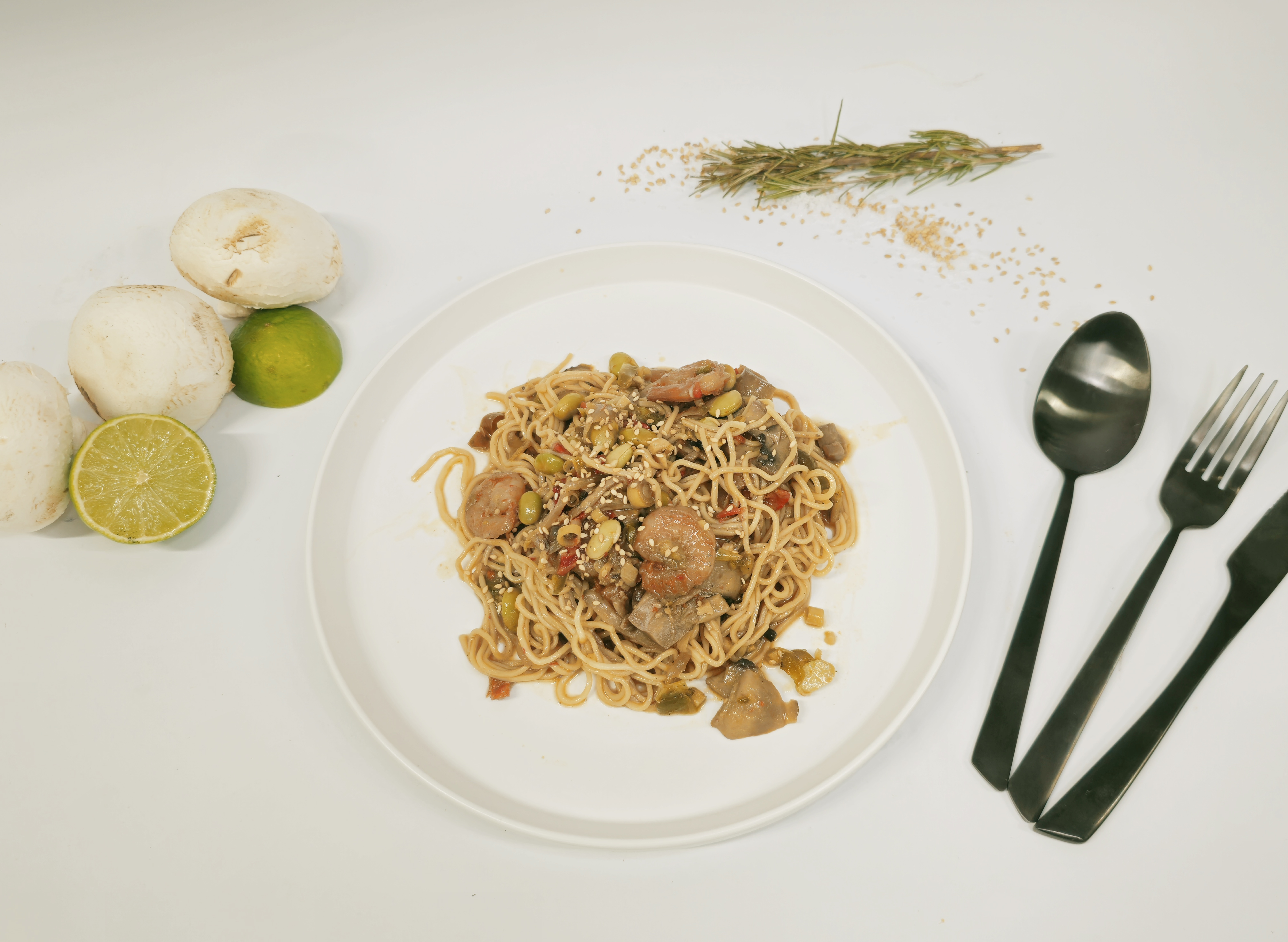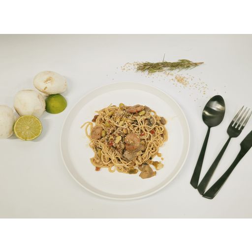 Pâtes chinoises 33,8% (farine de BLE tendre 59%, semoule de BLE dur 25%, OEUFS 15%, sel, correcteur d'acidite: E501), crevettes 20,3% (CREVETTES (Penaeus vannamei, elevées en Inde, Vietnam, Équateur), sel, acidifiants : acide lactique, acétate de sodium, citrates de sodium), poivron lanière (poivrons rouge et vert), champignon blanc, oignon rouge, Fèves Edamame (Fèves de SOJA Edamame, eau, acidifiant: acide citrique, sel), huile d'olive vierge extra, sauce soja (eau, graines de SOJA, BLE, sel), graine de SESAME, Huile de NOISETTES.