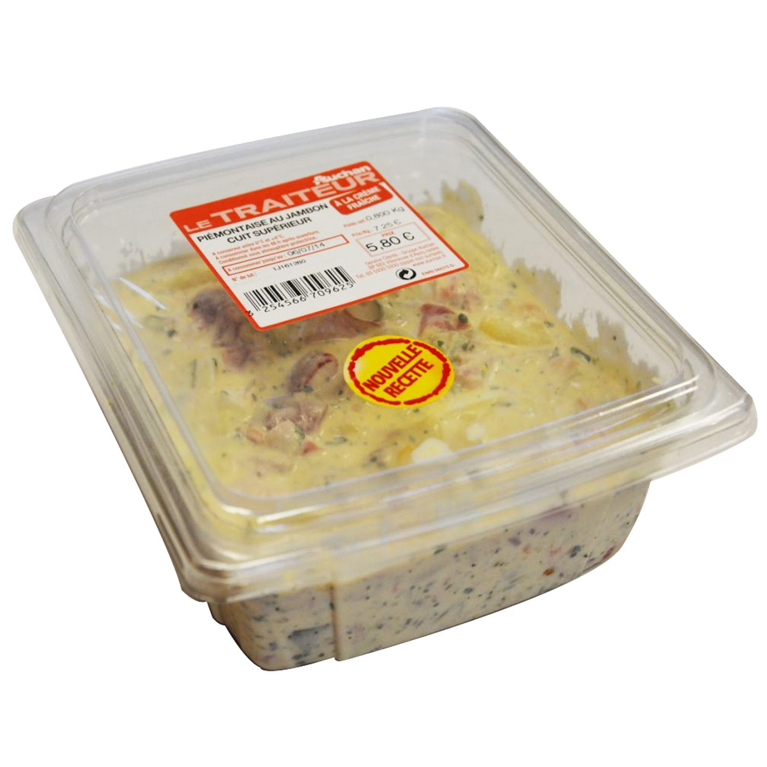 Ingrédients : Pommes de terre cuites salées 39,6 %, jambon cuit supérieur 12% (jambon de porc 11,2% (origine France), sel, dextrose, arôme naturel, antioxydant : érythorbate de sodium, conservateur : nitrite de sodium), OEUFS durs 12%, tomates 10,5%, huile de colza, eau, cornichons au vinaigre 2,5% (cornichons, eau, vinaigre d'alcool, sel, affermissant : chlorure de calcium, conservateur : disulfite de potassium), CRÈME fraîche liquide, vinaigre d’alcool, jaune d’OEUF, persil, sel, MOUTARDE de Dijon (eau, graines de MOUTARDE, vinaigre d’alcool, sel), épaississant : gomme xanthane.