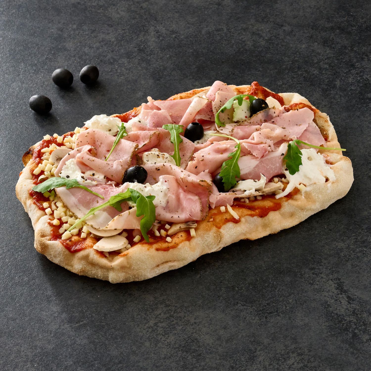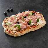 Fond de pinsa à la mozzarella râpée, la mozzarella burrata, au jambon cuit, tartare de tomate et aux champignons.