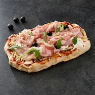 Fond pinsa 47,9% (Farine de BLÉ, eau, semoule de riz, farine de riz, huile d'olive extra vierge 1,3%, sel, levure), tartare de tomates 16,7% (Tomates fraiches (69%), tomates confites (17%), huile d'olive extra vierge, basilic, conservateur: lactate de potassium (E326), preparation epaississante: (amidon modifie, epaississant: gomme xanthane (E415), dextrose, acidifiants: E330, E334, LACTOSE, maltodextrine), ail (0,3%), antioxydant: E301, sucre, origan, sel), burrata (LAIT entier de vache pasteurisé (origine italie), CRÈME légère UHT (35%), sérum d'ensemencement naturel (dont LAIT), sel, coagulant microbien), champignon blanc 6,2%, jambon cuit 6,2% (jambon de porc, sel, dextrose, aromes, antioxygene: E301, conservateur: E252), mozzarella râpée 6,2% (LAIT de vache pasteurisé (origine UE), protéines de LAIT, sel, correcteur d'acidité : E330, ferments LACTIQUES, coagulant microbien, conservateur : E202, anti agglomérant : amidon), olives noires dénoyautées (olives, eau, sel, stabilisant : E579).