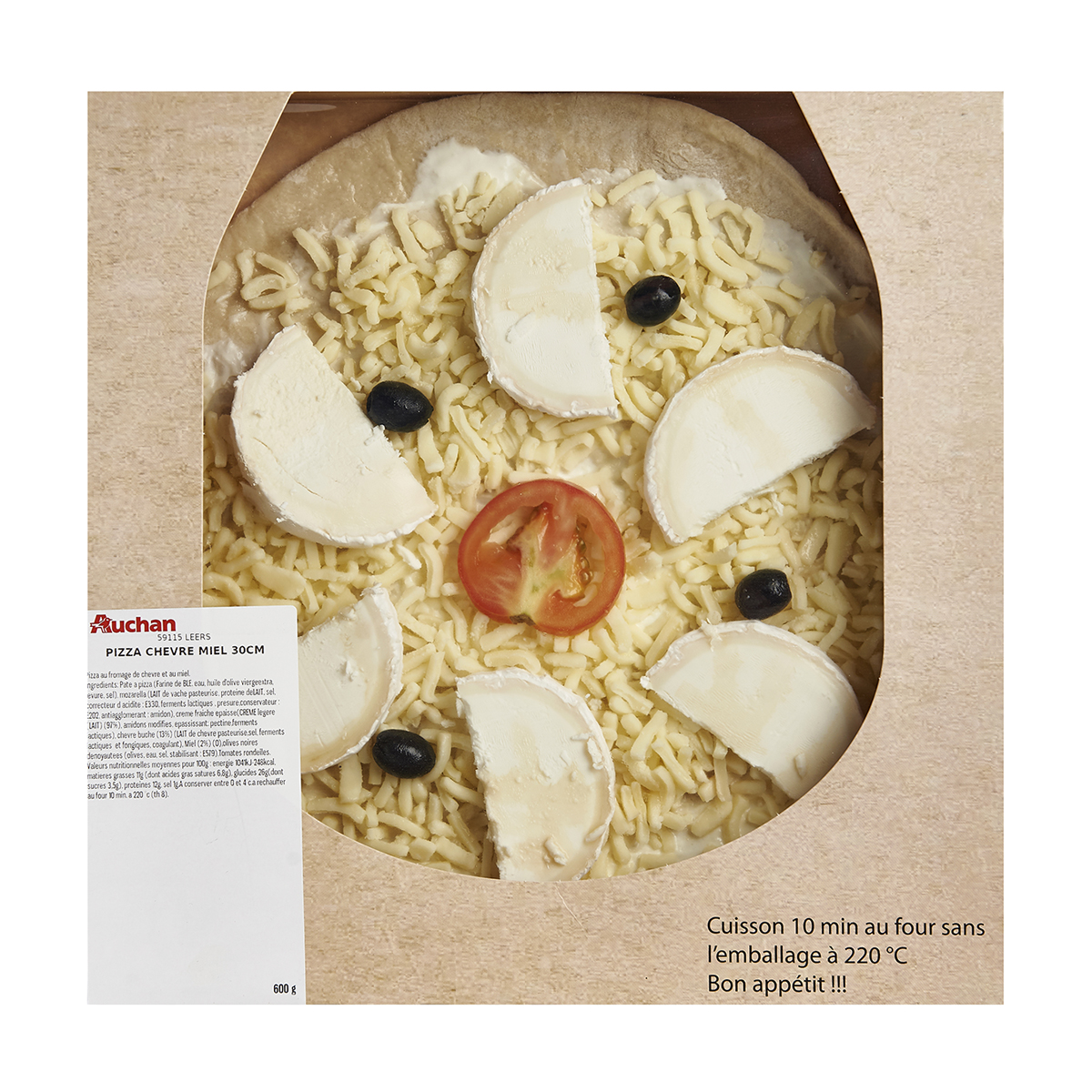 fond de pizza 43% (farine de BLE, eau, levain (GLUTEN), huile d'olive vierge extra, sel, levure), mozzarella râpée 24,8% (LAIT de vache pasteurisé (origine UE), protéines de LAIT, sel, correcteur d'acidité : E330, ferments LACTIQUES, coagulant microbien, conservateur : E202, anti agglomérant : amidon), Crème fraîche légère épaisse 13,2% (CRÈME légère pasteurisée (Origine France) 97%, amidon modifié, épaississant : E440, ferments LACTIQUES), fromage de chèvre 12,4% (LAIT de chèvre pasteurisé (origine France), sel, ferments LACTIQUES et fongiques, coagulant), miel 2,5% (miel), olives noires dénoyautées (olives, eau, sel, stabilisant : E579), tomate.