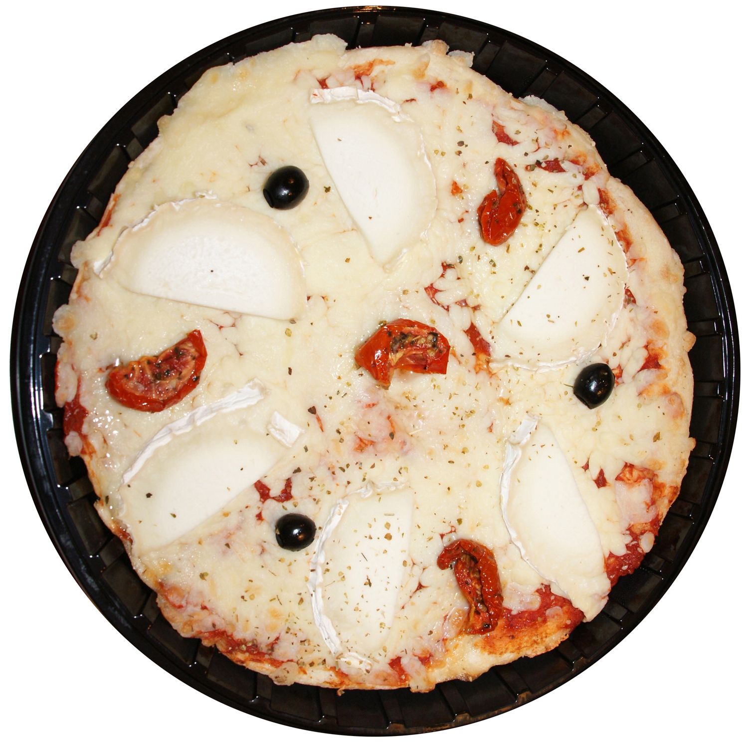fond de pizza 44,1% (farine de BLE, eau, levain (GLUTEN), huile d'olive vierge extra, sel, levure), mozzarella râpée 25,5% (LAIT de vache pasteurisé (origine UE), protéines de LAIT, sel, correcteur d'acidité : E330, ferments LACTIQUES, coagulant microbien, conservateur : E202, anti agglomérant : amidon), fromage de chèvre 12,7% (LAIT de chèvre pasteurisé (origine France), sel, ferments LACTIQUES et fongiques, coagulant), sauce à pizza 11,9% (98 % tomates, sel, huile de tournesol, sucre, herbes aromatiques, ail, régulateur d'acidité : E330), tomates confites (Tomates semi-déshydratées (71,30%) (tomates, ail, basilic, origan, thym, sel, sucre, antioxydant :E330), huile de colza), olives noires dénoyautées (olives, eau, sel, stabilisant : E579).