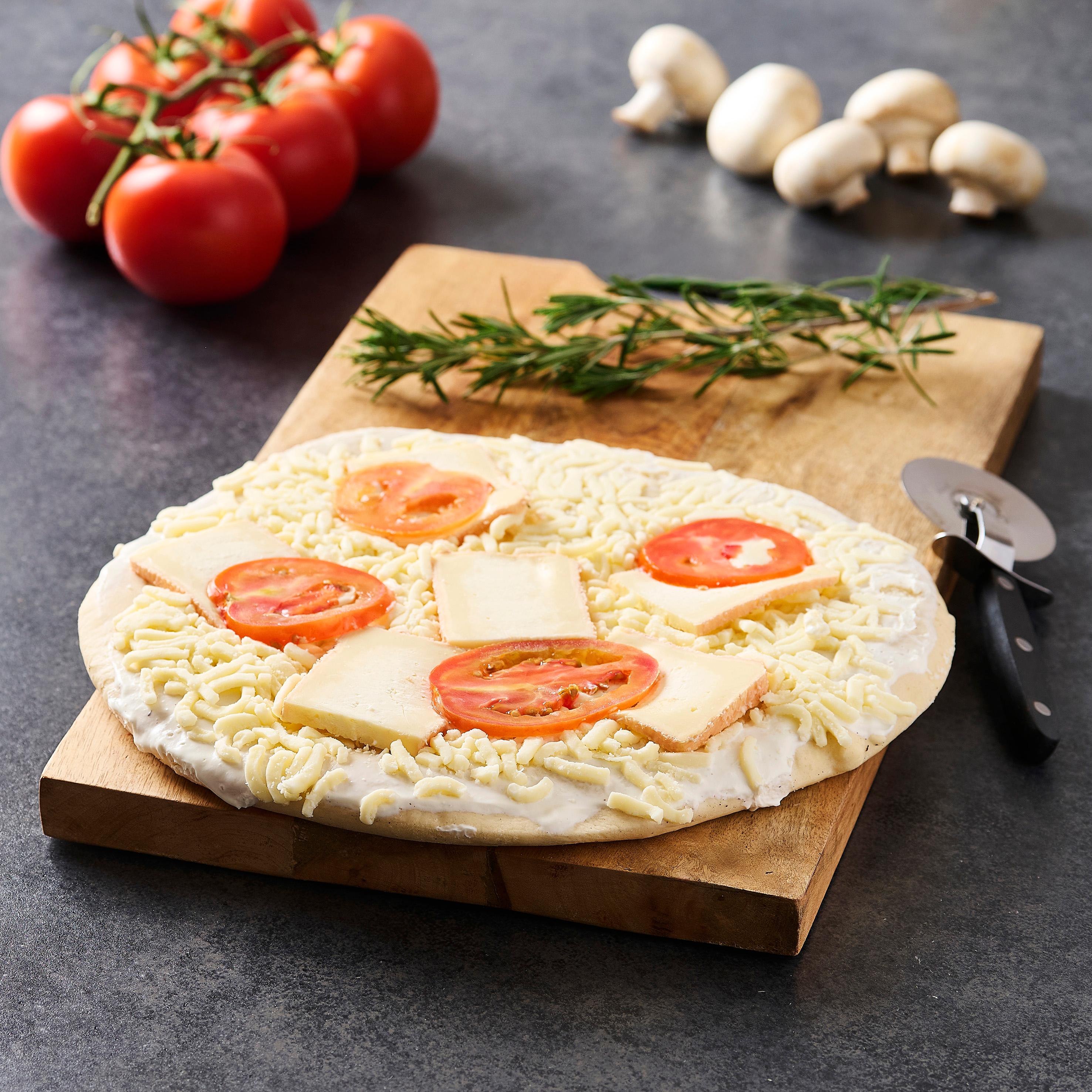 fond de pizza 41,1% (farine de BLE, eau, levain (GLUTEN), huile d'olive vierge extra, sel, levure), mozzarella râpée (LAIT de vache pasteurisé (origine UE), protéines de LAIT, sel, correcteur d'acidité : E330, ferments LACTIQUES, coagulant microbien, conservateur : E202, anti agglomérant : amidon), maroilles 14,2% (LAIT de vache pasteurisé (Origine France), sel alimentaire, ferments LACTIQUES, ferments d'aromatisation, présure animale), Crème fraîche légère épaisse (CRÈME légère pasteurisée (Origine France) 97%, amidon modifié, épaississant : E440, ferments LACTIQUES), tomate.