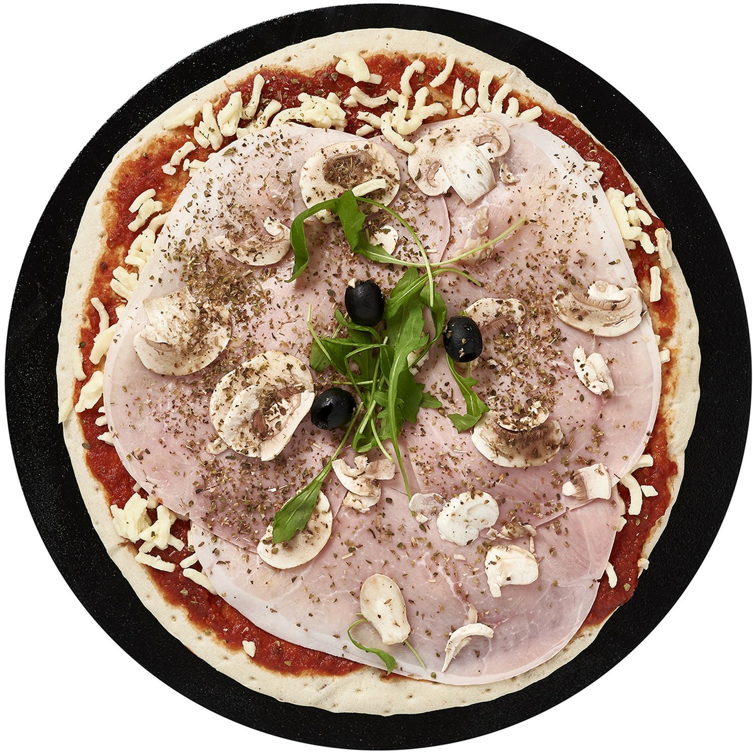 fond de pizza 42,4% (farine de BLE, eau, levain (GLUTEN), huile d'olive vierge extra, sel, levure), mozzarella râpée 24,5% (LAIT de vache pasteurisé (origine UE), protéines de LAIT, sel, correcteur d'acidité : E330, ferments LACTIQUES, coagulant microbien, conservateur : E202, anti agglomérant : amidon), jambon cuit 12,2% (jambon de porc, eau, sel, dextrose, arômes naturels (présence naturelle de polyphénols), bouillon (eau, arôme naturel, oignon, ail, poivre noir, noix de muscade, clou de girofle, thym, laurier), antioxydant : E300), sauce à pizza 11,4% (98 % tomates, sel, huile de tournesol, sucre, herbes aromatiques, ail, régulateur d'acidité : E330), champignons 7,3% (champignons, eau, sel, acidifiant : E330, antioxydant : E300), olives noires dénoyautées (olives, eau, sel, stabilisant : E579), origan.