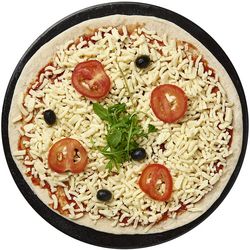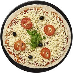fond de pizza 48% (farine de BLE, eau, levain (GLUTEN), huile d'olive vierge extra, sel, levure), mozzarella râpée 27,7% (LAIT de vache pasteurisé (origine UE), protéines de LAIT, sel, correcteur d'acidité : E330, ferments LACTIQUES, coagulant microbien, conservateur : E202, anti agglomérant : amidon), sauce à pizza 12,9% (98 % tomates, sel, huile de tournesol, sucre, herbes aromatiques, ail, régulateur d'acidité : E330), tomate 9,6%, olives noires dénoyautées (olives, eau, sel, stabilisant : E579).