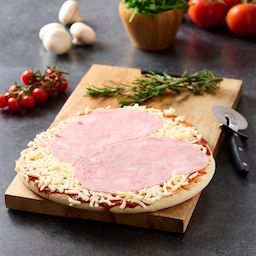 fond de pizza 46,4% (farine de BLE, eau, levain (GLUTEN), huile d'olive vierge extra, sel, levure), mozzarella râpée 26,8% (LAIT de vache pasteurisé (origine UE), protéines de LAIT, sel, correcteur d'acidité : E330, ferments LACTIQUES, coagulant microbien, conservateur : E202, anti agglomérant : amidon), lanières de jambon 14,3% (jambon de porc (83%), eau, sel, sirop de glucose de ble, conservateurs: E325, E250, aromes, dextrose de ble, stabilisants: E451 – E452, antioxydant: E316), sauce à pizza 12,5% (98 % tomates, sel, huile de tournesol, sucre, herbes aromatiques, ail, régulateur d'acidité : E330).