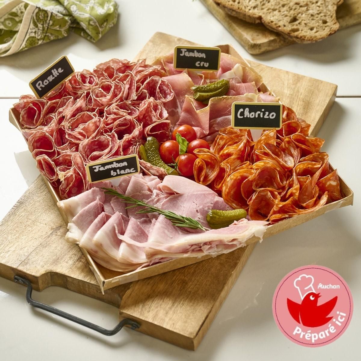 chorizo vela fort 27,7% (viande de porc (origine : Espagne), paprika, sel, LAIT en poudre, ail, protéines de SOJA, dextrine, dextrose, arôme de fumée, stabilisant : E450i E451i E452ii, antioxydant : E301, conservateur : E250 E252, traitement de surface : E202), jambon cuit supérieur dégraissé découenné 27,7% (jambon de porc issu d'animaux nourris sans OGM < 0,9% (origine France), sel, dextrose, arômes naturels, bouillon de porc, bouillon (eau, arôme naturel, oignon, ail, poivre noir, noix de muscade, clou de girofle, thym, laurier), antioxydant : E316, gélatine de porc, conservateur : E250), rosette 27,7% (viande de porc (origine : France), sel, LACTOSE, dextrose, saccharose, poivre, ail, conservateur : E252, ferments. 149 g de viande de porc utilisée pour 100 g de produit fini), jambon sec 7 mois 13,8% (jambon de porc (origine : France), sel), olives noires dénoyautées, tomate cerise.