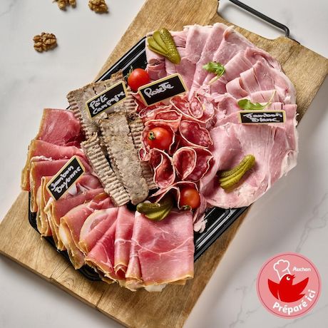 jambon cuit supérieur dégraissé découenné 32% ( jambon de porc (origine france), issu d'animaux nourris sans ogm (0,9%), sel, arômes naturels, dextrose, bouillon de porc, antioxydant : E316, conservateur : E250), terrine de campagne Label Rouge 32% (gorge de porc Label Rouge 30% (origine : France), foie de porc Label Rouge 23% (origine : France), gras de porc Label Rouge (origine : France), oignons, parure de poitrine de porc Label Rouge (origine : France), OEUFS, sel, LAIT, epices et aromates, fecule de pomme de terre, decor (gelee de glaçage (eau, gelatine de porc, vinaigre d'alcool, sel, colorant : E150a), crepine de porc)), jambon sec 7 mois 24% (jambon de porc (origine : France), sel), rosette 8% (viande de porc (origine : France), sel, LACTOSE, dextrose, saccharose, poivre, ail, conservateur : E252, ferments 149 g de viande de porc utilisée pour 100 g de produit fini), cornichons (contient SULFITES, MOUTARDE), olives noires dénoyautées, tomate cerise.