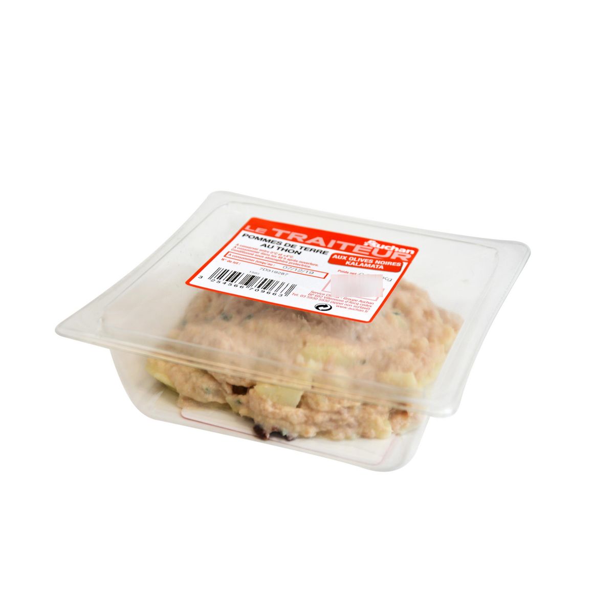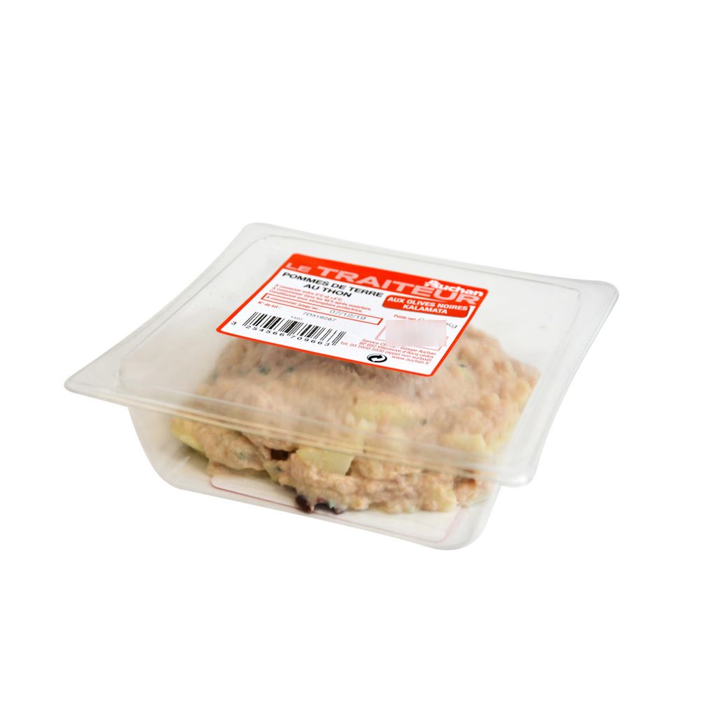 Ingrédients : Pommes de terre cuites salées 55,2%, THON Listao au naturel 22,3% (THON Listao, eau, sel), huile de colza, eau, olives noires variété Kalamon dénoyautées 3% (olives fermentées, eau, sel, vinaigre de vin rouge), vinaigre d’alcool, jus de citron concentré, ciboulette, moutarde de Dijon (eau, graines de MOUTARDE, vinaigre d’alcool, sel), sel, jaune d’OEUF, épaississant : gomme xanthane, conservateur : sorbate de potassium, ail, poivre blanc.