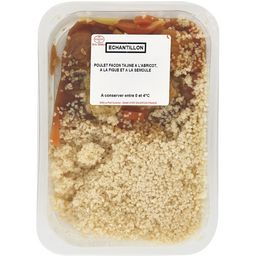 Ingrédients : Eau, haut de cuisse de poulet 25,7% (Origine UE), semoule de BLE dur 16,6% (Origine France), carotte 5,7% (Origine UE), huile de colza, figue 2,9% (Origine Hors UE), oignon 2,8% (Origine UE), abricot 1,4% (Origine Hors UE, antioxydant : anhydride sulfureux), sel, jus d'orange concentré, sucre, arôme (contient LAIT, BLE, CELERI), amidon modifié de maïs, gélatine de bœuf, ail en purée (ail, sel, acidifiant : acide citrique), préparation bouillon de légumes safrané [sel, maltodextrine, fécule, épices et plante aromatique (dont safran), arômes naturels, huile de tournesol, tomate, CRUSTACE en poudre, colorant : extrait de paprika], tomate en poudre, préparation pour assaisonnement "tandoori" (sucre, épices, amidon de maïs modifié, ail, sel, oignons, arôme, plantes aromatiques), épices raz el hanout (coriandre, cumin, romarin, fenouil, fenugrec, piment doux, piment fort, sel), menthe 0,1% (Origine UE ou Hors UE), arôme naturel cannelle, colorant : extrait de paprika, poudre de coriandre, arôme naturel poivre, extrait de MALT. Traces éventuelles de œufs, soja, poisson, mollusques, moutarde, sésame, fruits à coque et arachides.