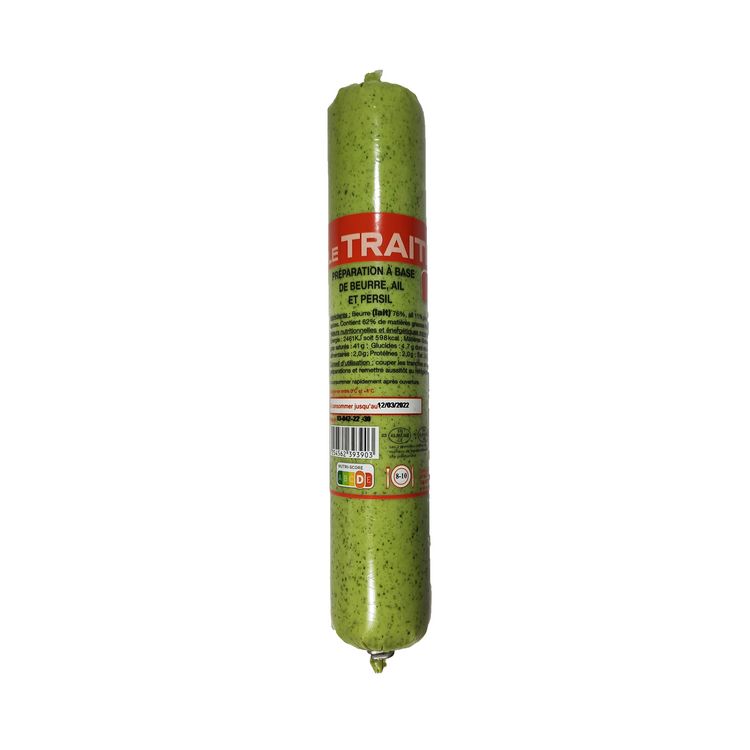 Ingrédients : Beurre (LAIT) 76% (matières grasses laitières 62%), ail 11%, persil 9%, échalote, sel, épices.