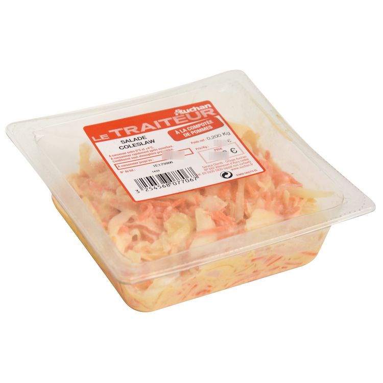 Ingrédients : Chou blanc râpé 41%, carotte râpée 20%, compote de pommes 11% (purée de pommes concentrée 10%, sirop de glucose-fructose, antioxydant : acide ascorbique), huile de colza, eau, CREME fraîche, jus d’orange concentré, jaune d’ŒUF, oignons, vinaigre d’alcool, MOUTARDE de Dijon (eau, graines de MOUTARDE, vinaigre d’alcool, sel), sel, sucre, épaississant : gomme xanthane, poivre blanc.