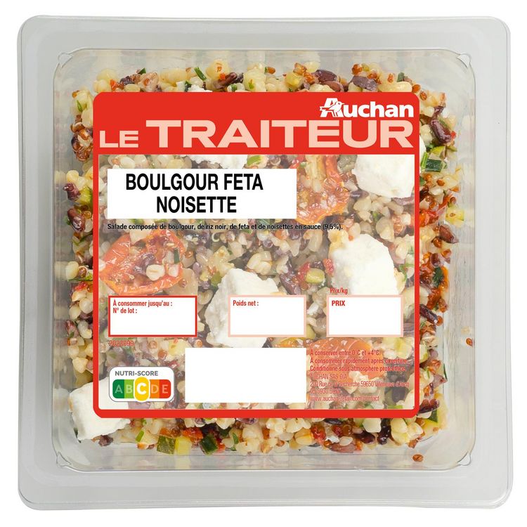 Ingrédients : Boulgour cuit 25,7% (eau, blé dur concassé précuit), riz noir cuit 13,9% (riz noir, eau), courgette, feta 10%, quinoa rouge cuit (eau, quinoa rouge), huile de colza, noisettes 4,1%, tomates cerises mi-séchées, eau, miel d’acacia, oignons, ciboulette, vinaigre d’alcool, moutarde à l’ancienne (eau, graines de moutarde, vinaigre d’alcool, sel), huile de noix, tomates mi-séchées, huile de tournesol, sel, moutarde de Dijon (eau, graines de moutarde, vinaigre d’alcool, sel), plantes aromatiques, épaississant : gomme xanthane, poivre blanc.