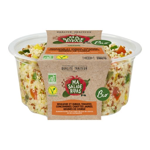 Salade de boulgour, quinoa, tomates et concombres en sauce, issue de l’agriculture biologique Des ingrédients BIO Une valeur sure : le mélange "boulgour et quinoa" associé à des légumes croquants et colorés Un assaisonnement réhaussé au jus de citron et à la coriandre