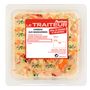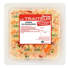 Ingrédients : Surimi 15,4% (eau, chair de poisson 5,3%, blanc d’œuf réhydraté, fécule de pomme de terre, amidon de blé, huile de colza, sucre, sel, arôme naturel (contient poisson, crustacés), colorant : extrait de paprika), courgettes 15,4%, carottes 14,9%, crevettes cuites décortiquées 12,9%, huile de colza, mandarines préservées 6,9% (mandarines, eau, sucre, acidifiant : acide citrique), poivrons 5,9%, eau, vinaigre d’alcool, raisins secs, jaune d’œuf, sel, moutarde de Dijon (eau, graines de moutarde, vinaigre d’alcool, sel), ciboulette, menthe douce, sucre, acidifiant : acide citrique, conservateur : sorbate de potassium, épaississant : gomme xanthane, poivre blanc.