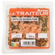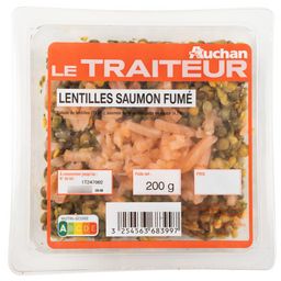 Ingrédients : Lentilles vertes cuites 46% (lentilles vertes, eau), lentilles corail cuites 13,5% (lentilles corail, eau), lentilles blondes cuites 13,5% (lentilles blondes, eau), saumon fumé 8,5% (saumon Atlantique Salmo salar, sel), courgette 7,6%, huile de colza, vinaigre d’alcool, eau, épices et plantes aromatiques, vinaigre balsamique (vinaigre de vin, moût de raisin cuit), persil, ciboulette, sel, moutarde de Dijon (eau, graines de moutarde, vinaigre d’alcool, sel), épaississant : gomme xanthane.