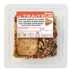 Ingrédients : Ingrédients : Pavé de SAUMON 22% (Salmo salar), poivrons 12%, quinoas blanc et rouge 10%, boulgour et semoule de BLE dur 10%, oignon 8,8%, fève de SOJA 7,6%, carotte 6,1%, pousse de haricot mungo 5,7%, champignon noir 4,9%, épi de maïs 3,7%, huile de tournesol, huile de SESAME, arôme naturel, curry vert 0,9% (piment, huile de tournesol, citronnelle, ail, oignon, sel, gingembre, coriandre, jus de citron, combawa, cumin, vinaigre d'alcool, épices), ail, gingembre, coriandre, sel. % exprimé sur le total de la recette. Conditionné sous atmosphère protectrice.