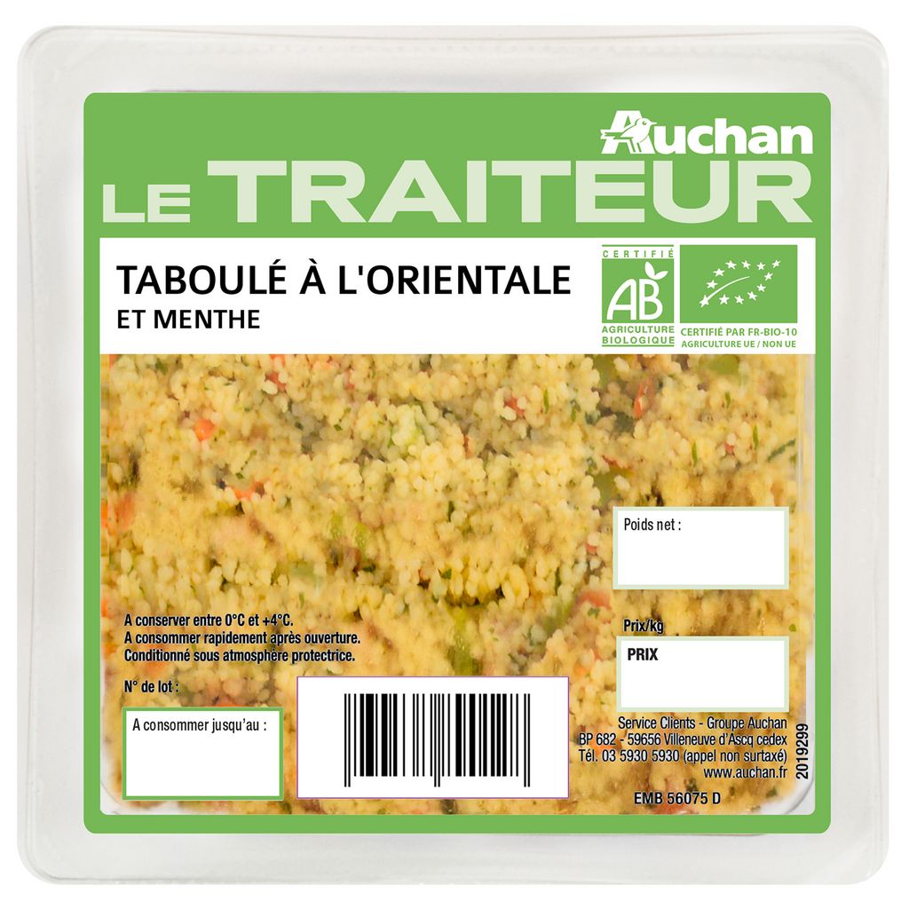 Ingrédients : Semoule de BLÉ dur réhydratée* 46%, poivrons verts* 8,5%, tomates* 8,4%, huile de tournesol*, carottes* 8%, eau, oignons* 4%, raisins secs* 4% (raisins secs*, huile de tournesol*), vinaigre d’alcool*, huile d’olive vierge extra*, menthe* 1,5%, sel, MOUTARDE de Dijon* (graines de MOUTARDE*, vinaigre d’alcool*, eau, sel), jus de citron concentré*, épices* et plantes aromatiques*, épaississant : gomme xanthane, poivre blanc*, farine de riz*.