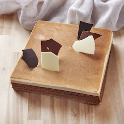 Un entremet composé de mousses et de biscuit cacao aux trois chocolats, le tout joliment décoré de croustillant au praliné.