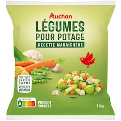 Ingrédients : Carottes 20%, poireaux 20%, pommes de terre 15%, choux-fleurs 15%, CÉLERI 10%, haricots verts 10%, petits pois 10%.