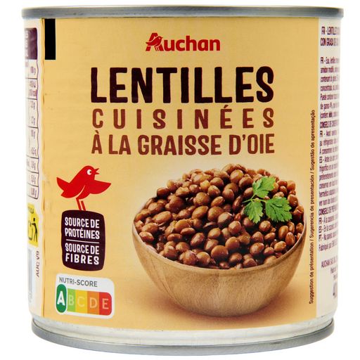 Ingrédients : Eau, lentilles trempées 43%, graisse d’oie 4%, purée de tomates double concentrée, sel, amidon modifié, arômes naturels (contient : LAIT), oignon poudre. Traces éventuelles de céréales contenant du gluten.