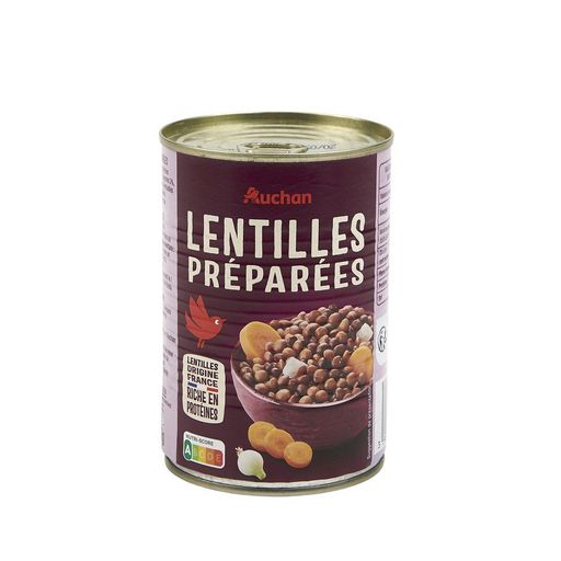 Ingrédients : Eau, lentilles sèches trempées 40%, carottes 3%, oignons 3%, sel, arômes naturels.Traces éventuelles de céréales contenant du gluten.Elaboré à partir de lentilles et de carottes origine France. Les oignons sont d'origine UE.