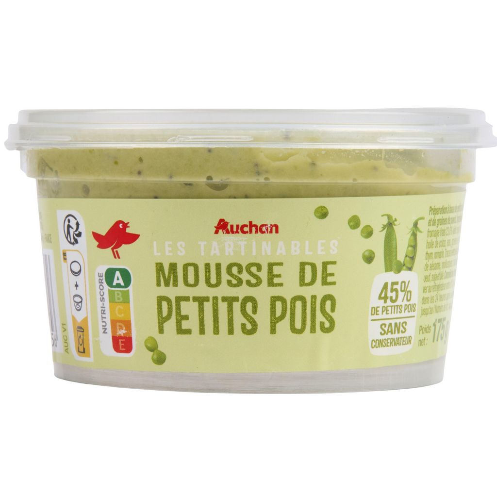 Ingrédients : Petit pois 45%, fromage frais 23,6% (LAIT origine France), pois chiche, huile de colza, eau, graines de pavot 0,8%, sel, ail, thym, romarin. Traces éventuelles de crustacés, graines de sésame, mollusques, moutarde, poisson, céleri, œuf, soja et blé.