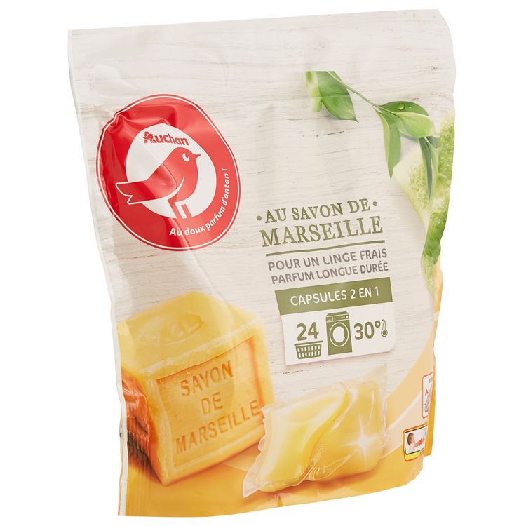 Au savon de Marseille.100% solublesPour un linge fraisEfficace dès 30°CParfum longue durée