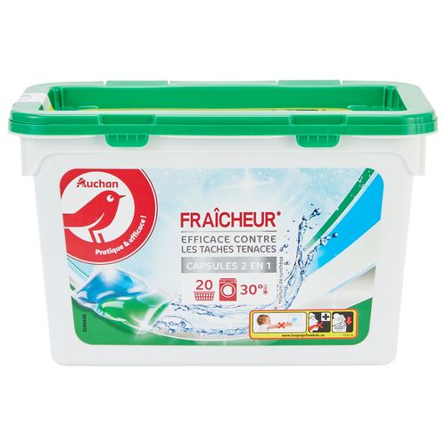 La lessive en capsules Auchan fraîcheur vous garantit un linge frais et une propreté éclatante en un seul geste. Pratique et efficace contre les taches tenaces, son film hydrosoluble se dissout dès 30°C sans laisser de résidus.