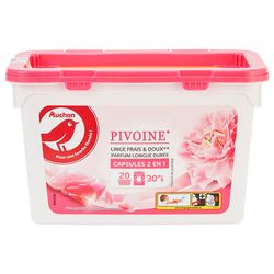 La lessive en capsules Auchan pivoine vous garantit un linge frais et propre en un seul geste. Pratique et efficace, son film hydrosoluble se dissout dès 30°C sans laisser de résidus.