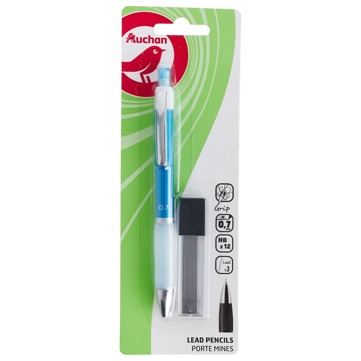 Le porte-mines 0.7 mm Auchan bleu est idéal pour le dessin technique ou simplement pour faire ses exercices. Son bouton possède gomme. Pack avec 12 mines.