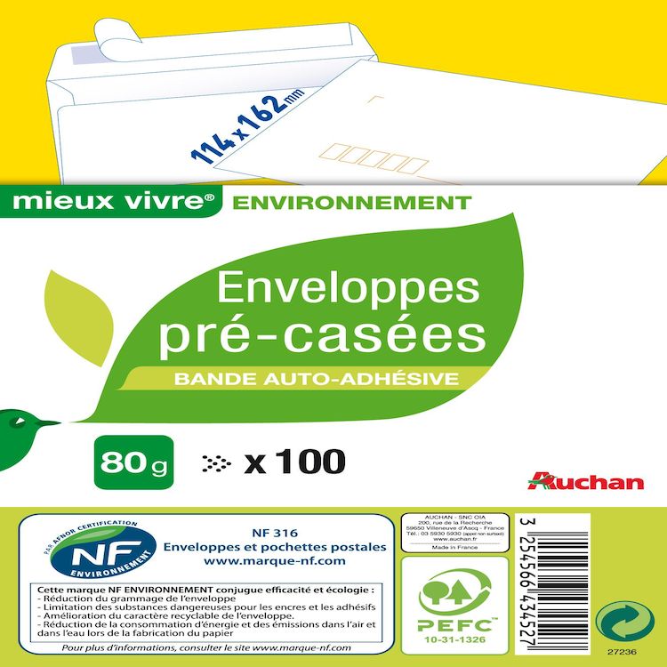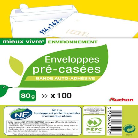 Lot de 100 enveloppes pré-casées auto-adhésives. Papier blanc. 80 Gr. Papier PEFC.