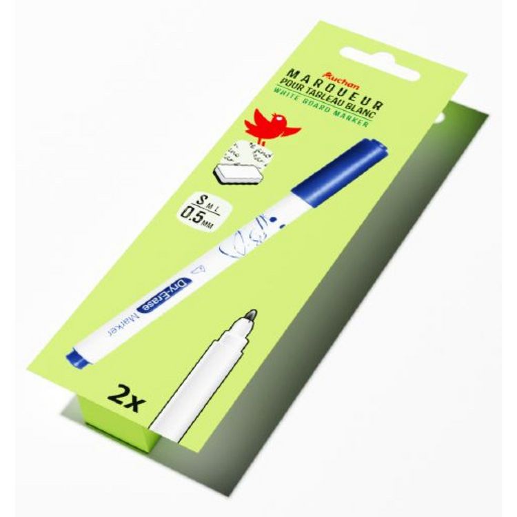 Ce pack de 2 marqueurs est incontournable au bureau pour écrire sur les tableaux blancs lors des présentations professionnelles, sur les ardoises blanches en classe ou sur les pense-bêtes à la maison. Doté d’une pointe ogive fine de 0.5 mm, résistante à la pression, chaque marqueur s’efface à sec, sans laisser de trace, à l’aide d’un chiffon doux ou d’une brosse en feutrine pour ne pas rayer le support. Facilement reconnaissable grâce à leur capuchon à la couleur de l’encre, ces marqueurs quasiment inodores offrent un séchage rapide ainsi qu’une écriture nette et sans bavure. Couleur de l’encre : bleu.