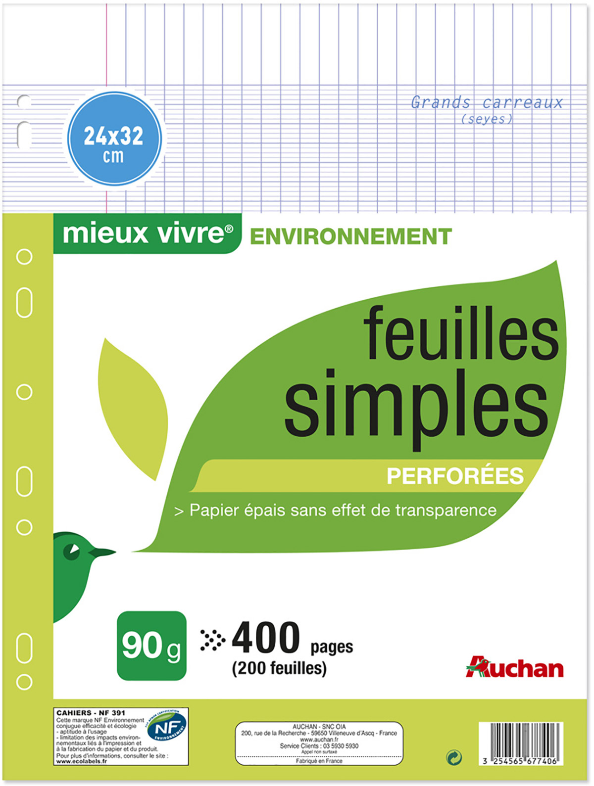 En savoir +Feuilles simples perforées. Papier certifié N.F. Grands carreaux. 90Gr. 400 pages (200 feuilles). Papier épais sans effet de transparence.