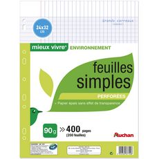 Feuilles simples perforées. Papier certifié N.F. Grands carreaux. 90Gr. 400 pages (200 feuilles). Papier épais sans effet de transparence.