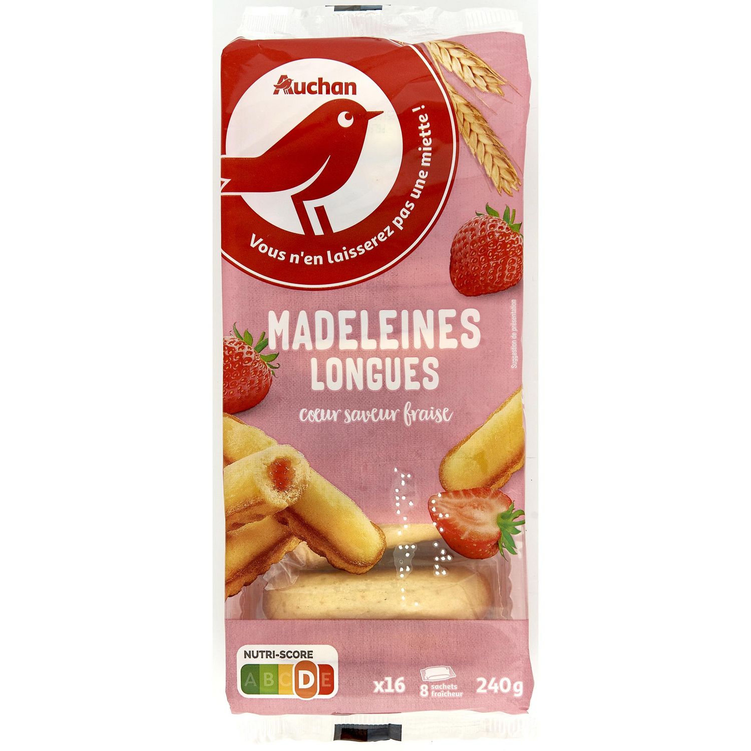 Une madeleine longue fourrée à la fraise, gourmande et moelleuse en sachet fraicheur par 2.. Idéale pour les goûters des enfants à glisser dans les cartables ou dans les poches.