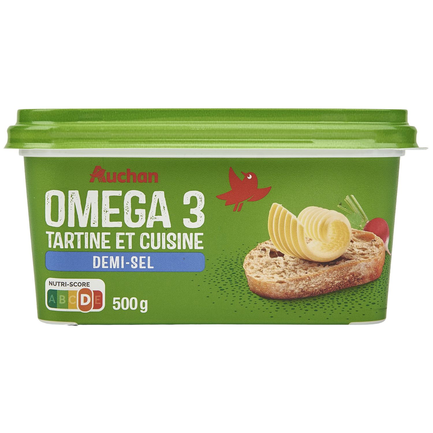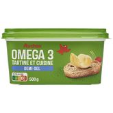 AUCHAN M.G.V. ALLEGEE BARQUETTE OMEGA 3 DEMI-SEL 50% 500G une Matière grasse à tartiner allégée à 50% de matières grasses, riche en acides gras Oméga 3, en déclinaison "demi-sel", en format 500g, pour déguster sur du pain ou des biscottes et pour cuisiner