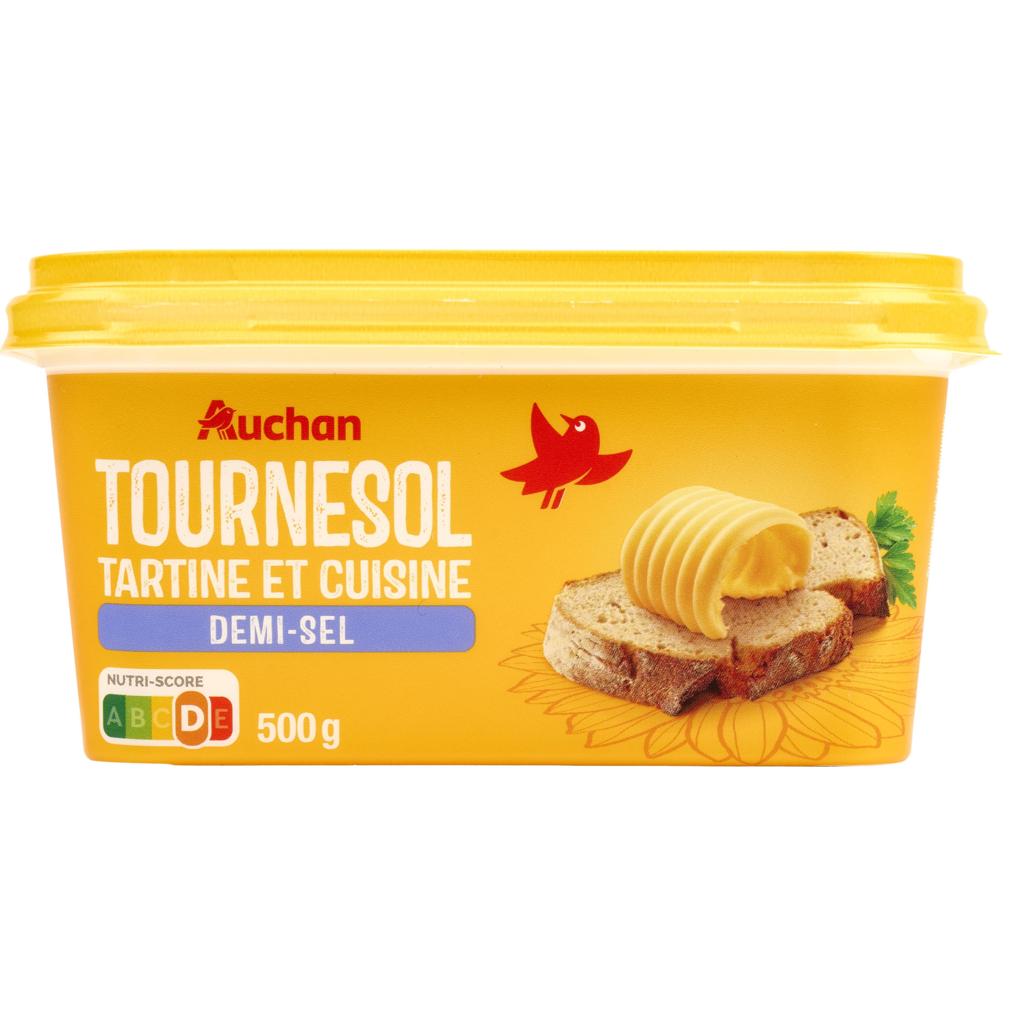 AUCHAN M.G.V. BARQUETTE TOURNESOL DEMI-SEL 60% 500G Une matière grasse végétale à 60% de matières grasses, majoritairement à base d'huile de tournesol, en déclinaison "demi-sel", en format 500g, pour déguster sur du pain ou des biscottes et pour cuisiner