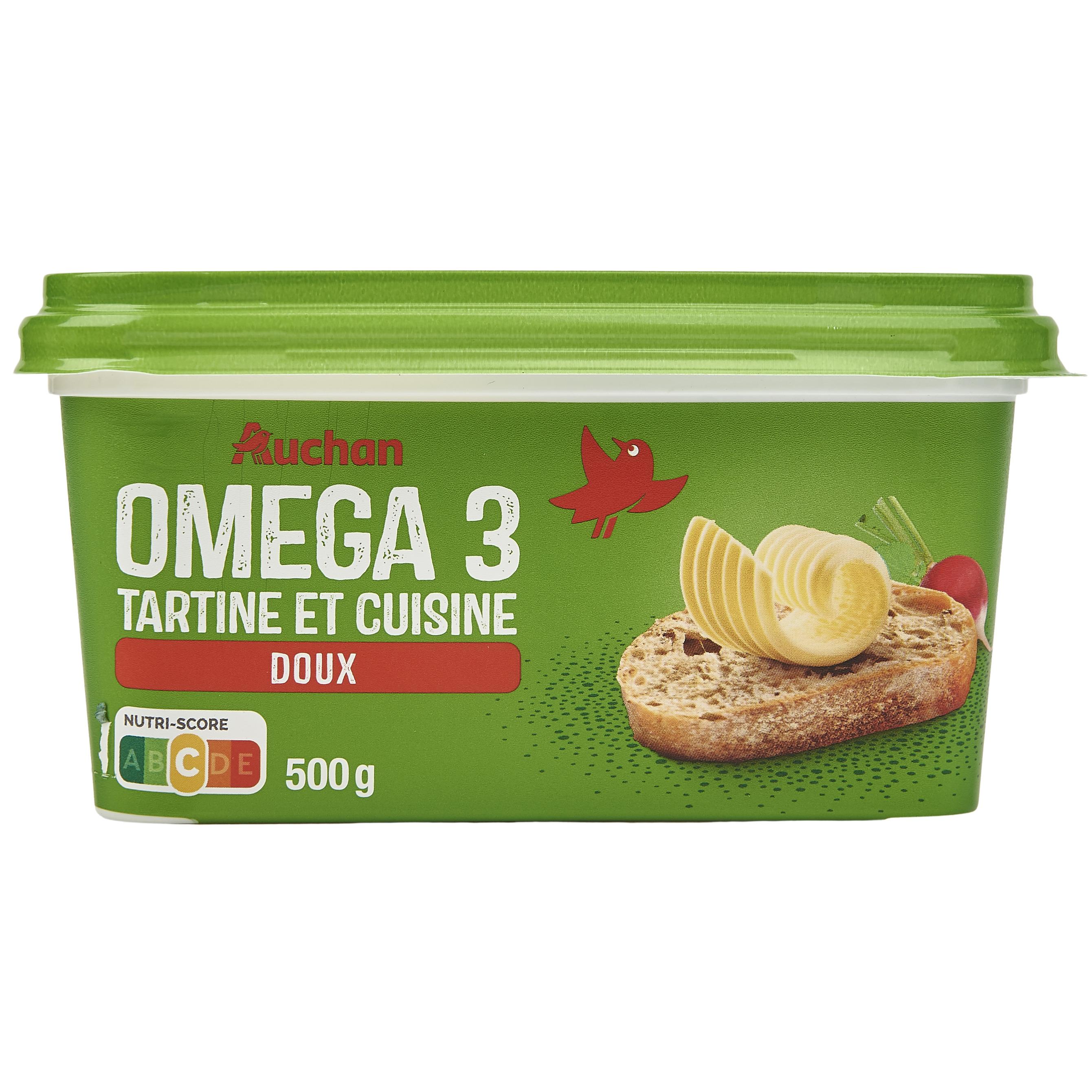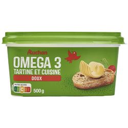 AUCHAN M.G.V. ALLEGEE BARQUETTE OMEGA 3 DOUX 50% 500G une matière grasse à tartiner allégée à 50% de matières grasses, riche en acides gras Oméga 3, en déclinaison "doux", en format 500g, pour déguster sur du pain ou des biscottes et pour cuisiner"