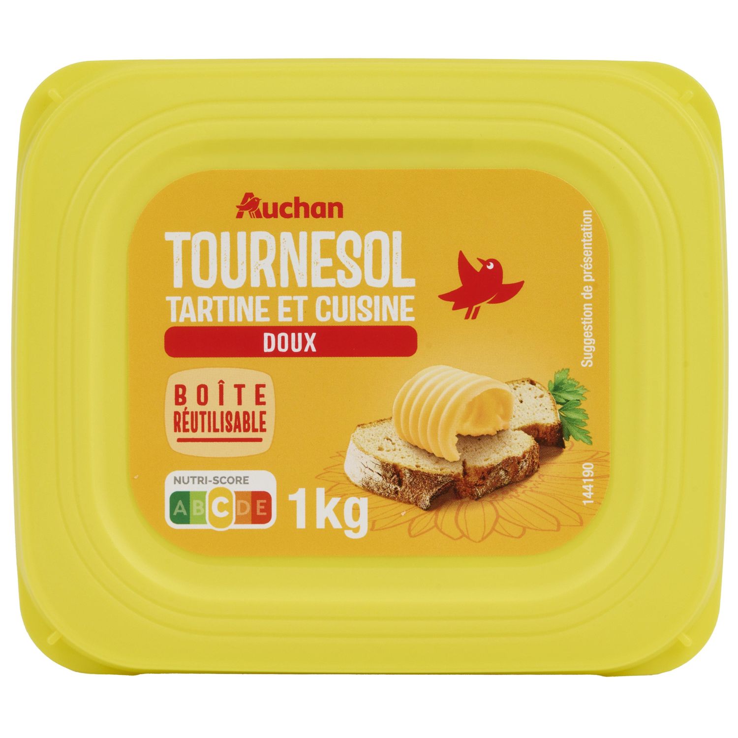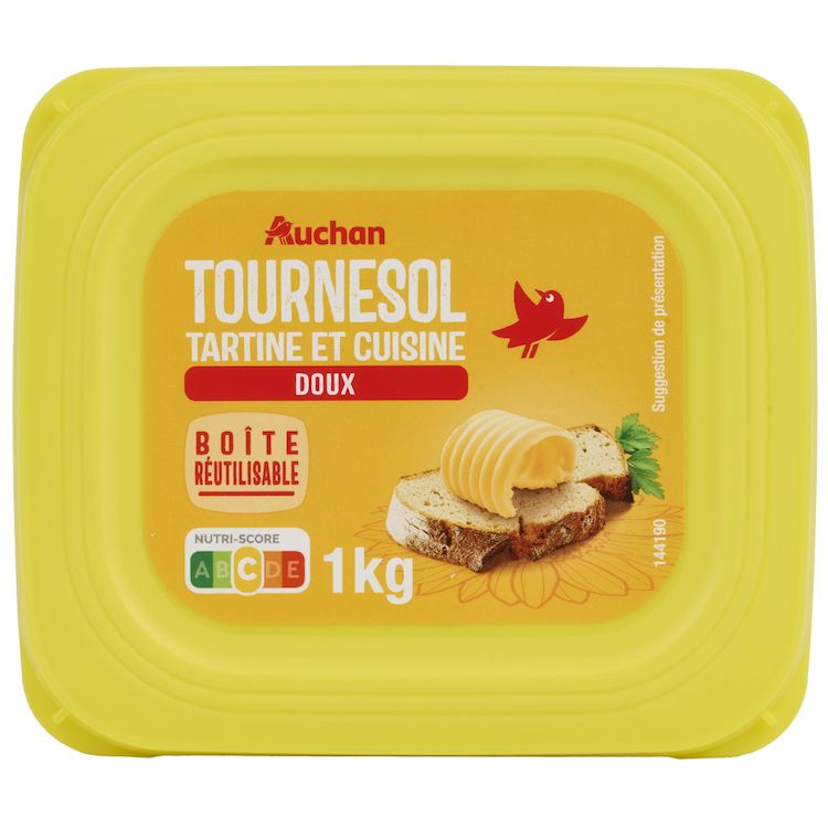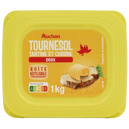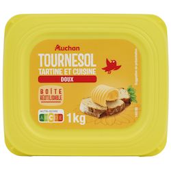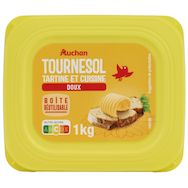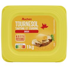 AUCHAN M.G.V. BARQUETTE TOURNESOL DOUX 60% 1KG Une matière grasse végétale allégée à 60% de matières grasses, majoritairement à base d'huile de tournesol, en déclinaison "doux", dans un grand format 1Kg, pour déguster sur du pain ou des biscottes et pour cuisiner"